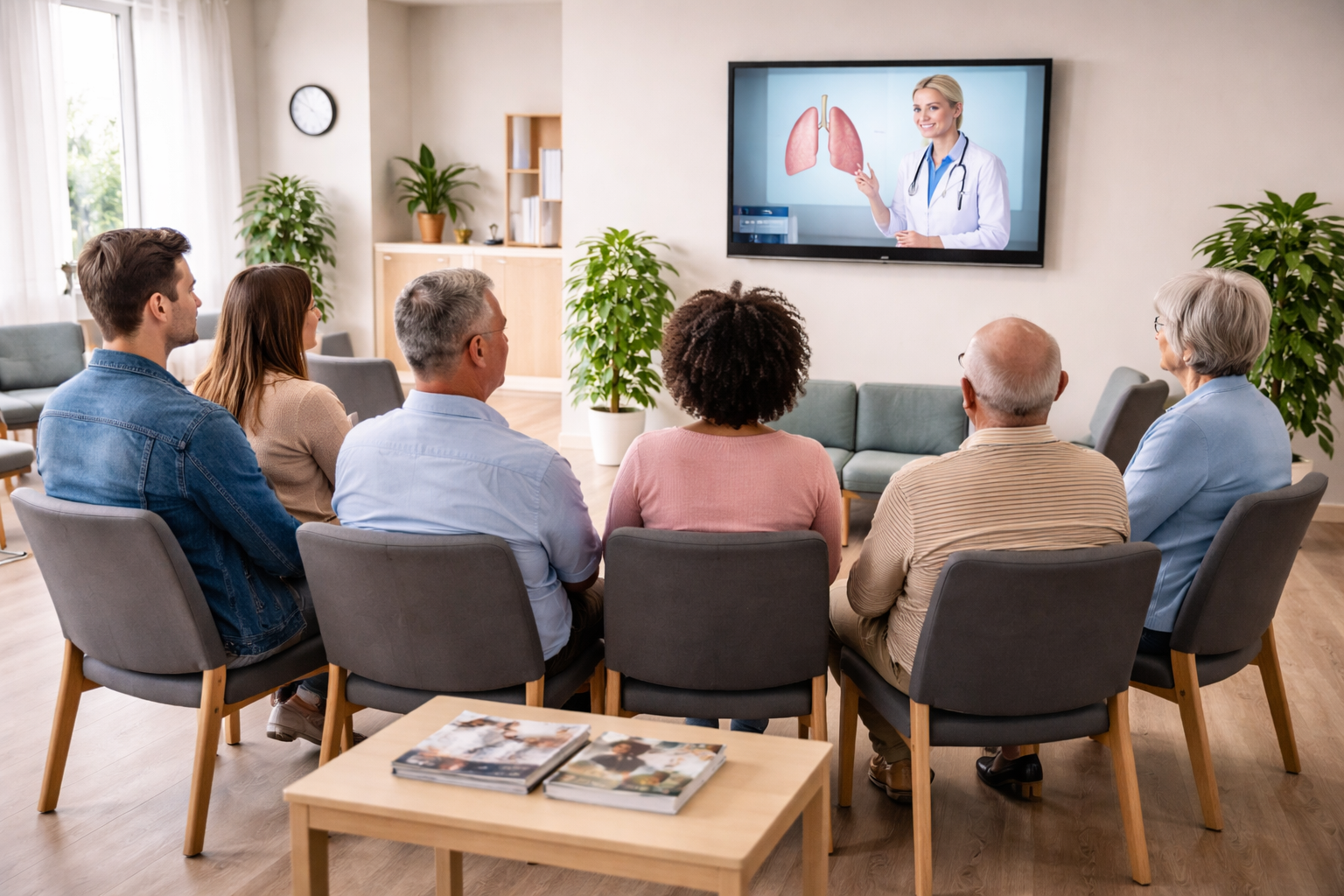 Studien zeigen, dass bis zu 87 % der Patienten im Wartezimmer aktiv auf Bildschirminhalte achten. Etwa 60–70 % erinnern sich anschließend an gezeigte Gesundheitstipps oder Präventionsinformationen. Quelle: CPMonitor